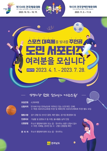 (무안=연합뉴스) 전승현 기자 = 전남도는 10∼11월 개최하는 제104회 전국체전과 제43회 전국장애인체전 도민 응원단을 모집한다고 30일 밝혔다.