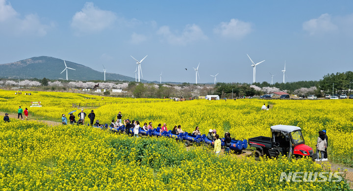 [서귀포=뉴시스] 우장호 기자 = 포근한 날씨를 보이는 29일 오후 제주 서귀포시 표선면 가시리 조랑말체험공원 유채꽃광장을 찾은 관광객들이 깊어가는 봄 정취를 만끽하고 있다. 2023.03.29. woo1223@newsis.com |