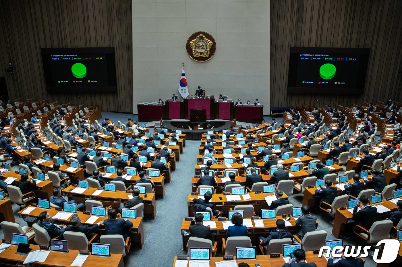 (서울=뉴스1) 이재명 기자 = 30일 오후 서울 여의도 국회에서 열린 제404회 국회(임시회) 제2차 본회의에서 주택임대차보호법 일부개정법률안(대안)이 재석 232인, 찬성 230인, 반대 0인, 기권 2인으로 가결되고 있다. 2023.3.30/뉴스1