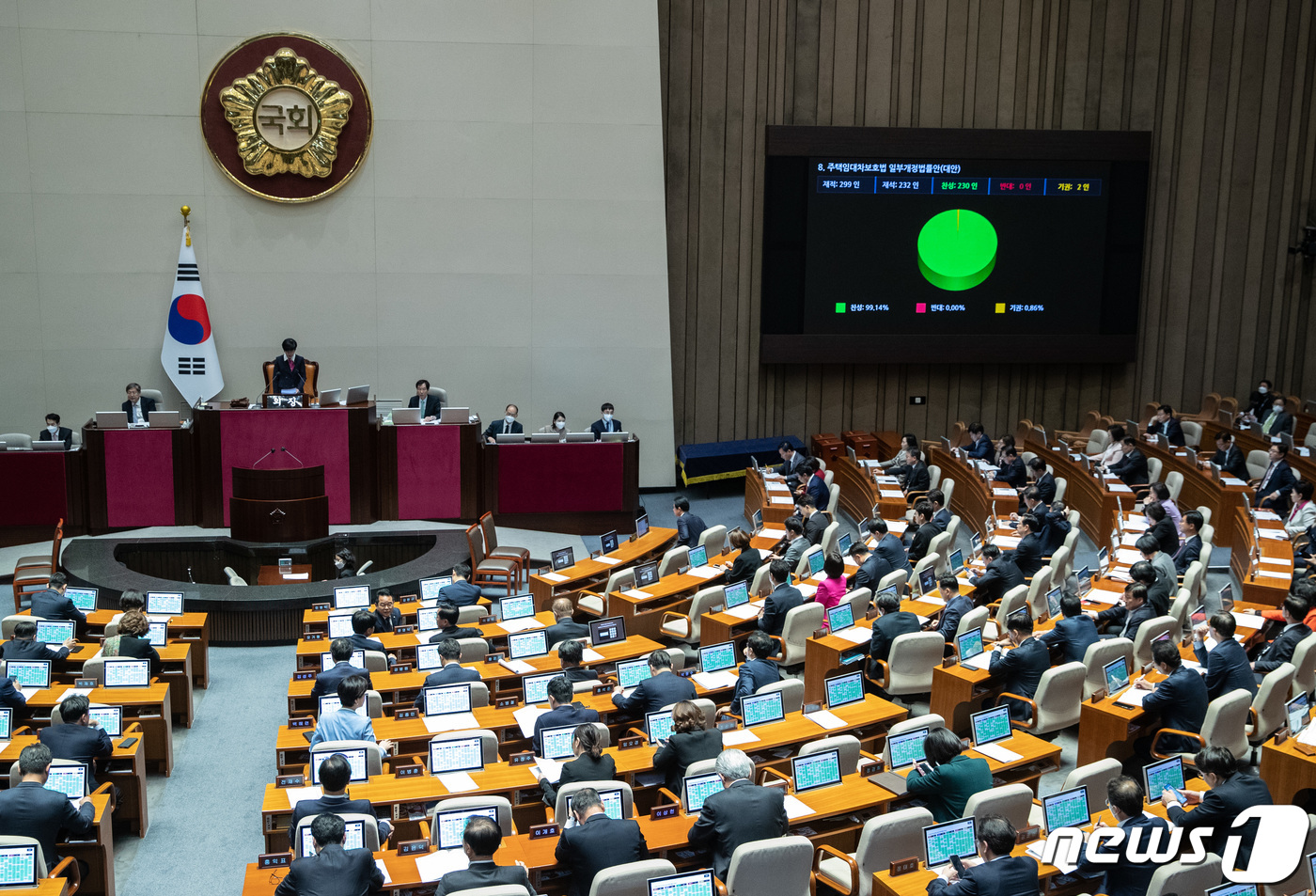 (서울=뉴스1) 이재명 기자 = 30일 오후 서울 여의도 국회에서 열린 제404회 국회(임시회) 제2차 본회의에서 주택임대차보호법 일부개정법률안(대안)이 재석 232인, 찬성 230인, 반대 0인, 기권 2인으로 가결되고 있다. 2023.3.30/뉴스1