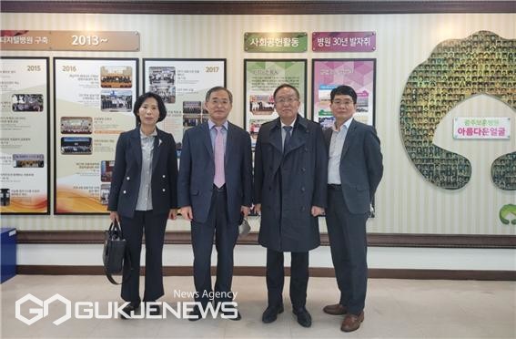 광주보훈병원-요양병원 벤치마킹 현장방문 모습 (왼쪽부터 : 부산보훈병원 간호실장, 광주보훈병원장, 부산보훈병원장, 부산보훈병원 운영실장)/제공=부산보훈병원 |