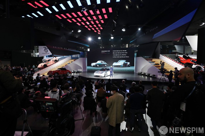 [고양=뉴스핌] 정일구 기자 = 30일 경기 고양시 킨텍스 제1전시장에서 열린 '2023 서울 모빌리티쇼' 프레스데이 행사에서 포르쉐의 스포츠카 75주년 기념 모델 '비전 357'이 가 공개되고 있다. 2023.03.30 mironj19@newspim.com