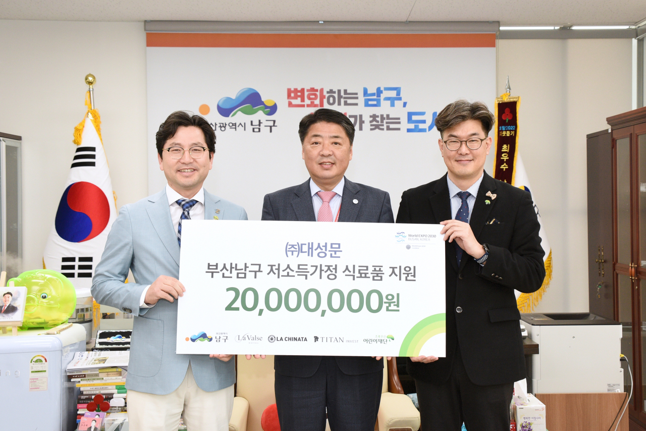 왼쪽부터 (주)대성문 채창호 대표이사, 남구청장, 초록우산 어린이재단 노희헌 부산지역본부장. [부산 남구 제공] |