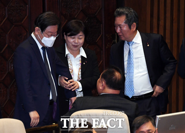 [더팩트ㅣ국회=이새롬 기자] 서영교 더불어민주당 최고위원(가운데)이 30일 오후 서울 여의도 국회에서 열린 본회의에서 이재명 대표(왼쪽)의 팔을 끌며 '비명계' 중진 이상민 의원(가운데 아래)과 대화하고 있다.