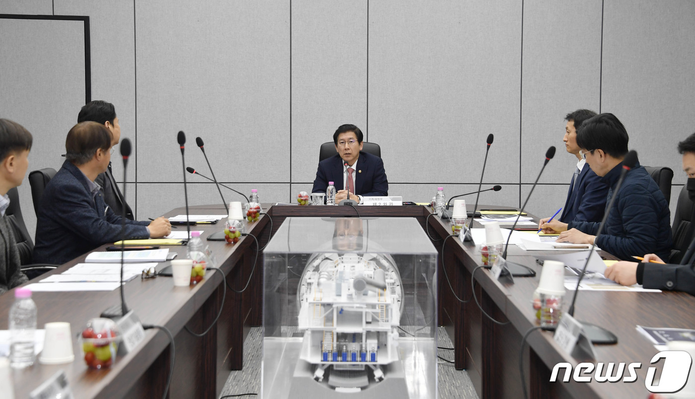 (서울=뉴스1) = 최상대 기획재정부 차관이 30일 공공기관 투자집행 현장방문차 한국도로공사 김포-파주 고속도로 한강터널 공사현장을 방문, 모두발언을 하고 있다. (기획재정부 제공) 2023.3.30/뉴스1
