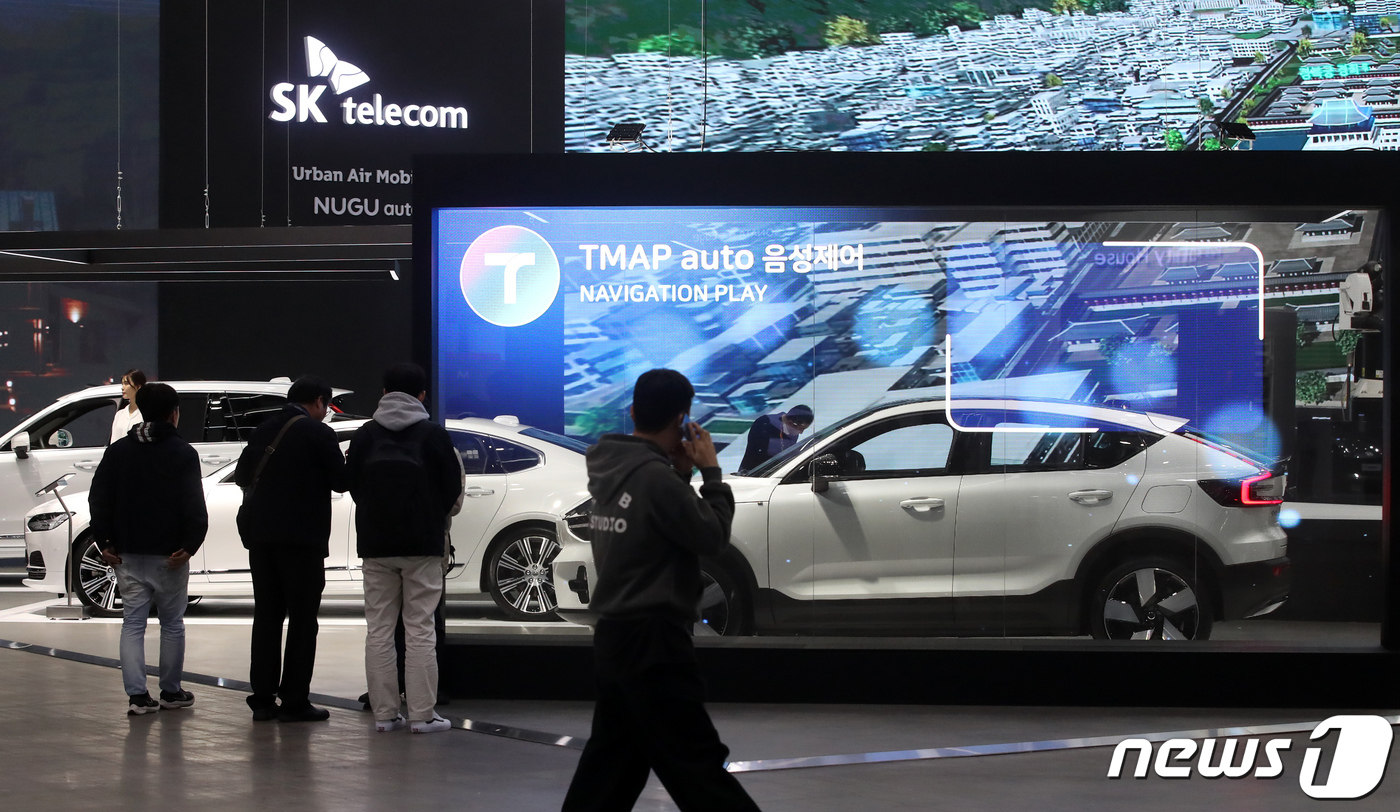 (고양=뉴스1) 이승배 기자 = 30일 경기도 고양시 킨텍스에서 열린 '2023 서울모빌리티쇼 SKT 부스에 차 전용 인공지능 플랫폼이 소개돼 있다. 2023 서울모빌리티쇼는 전 세계 12개국 163개 기업 및 기관이 참가해 지속가능하고 지능화된 이동혁명을 주제로 다음달 9일까지 고양시 킨텍스 1전시장에서 열린다. 2023.3.30/뉴스1