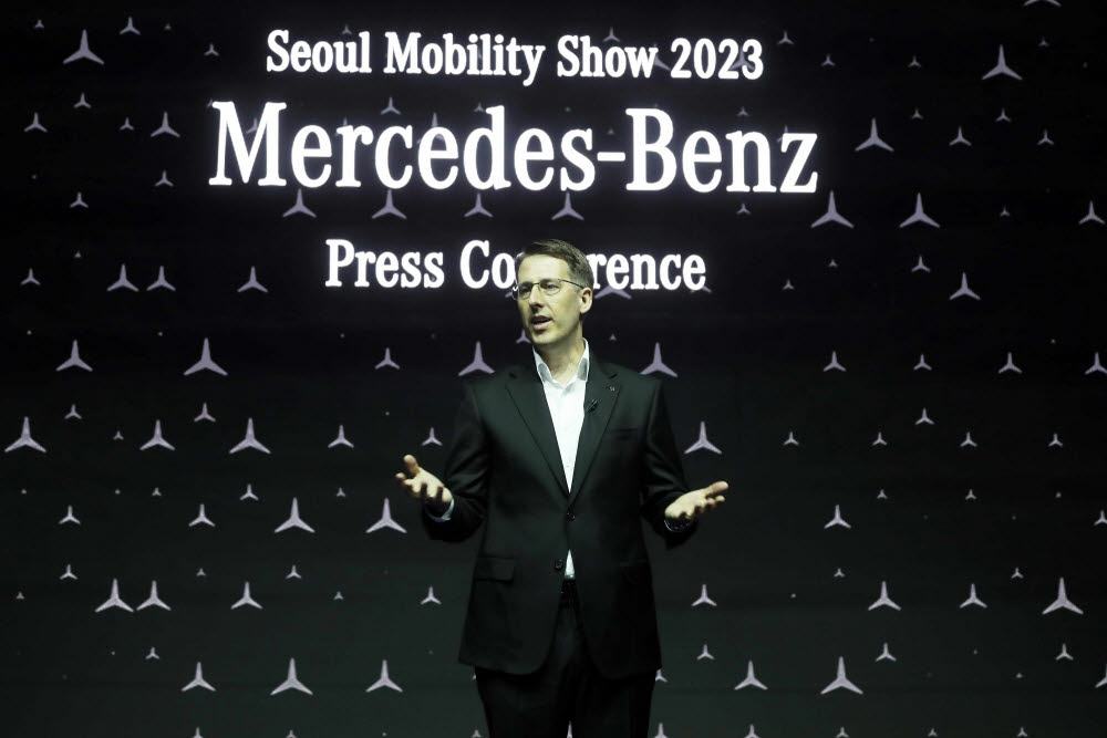 토마스 클라인 메르세데스-벤츠코리아 사장이 2023 서울모빌리티쇼 프레스데이에서 향후 전략을 발표하고 있다. |