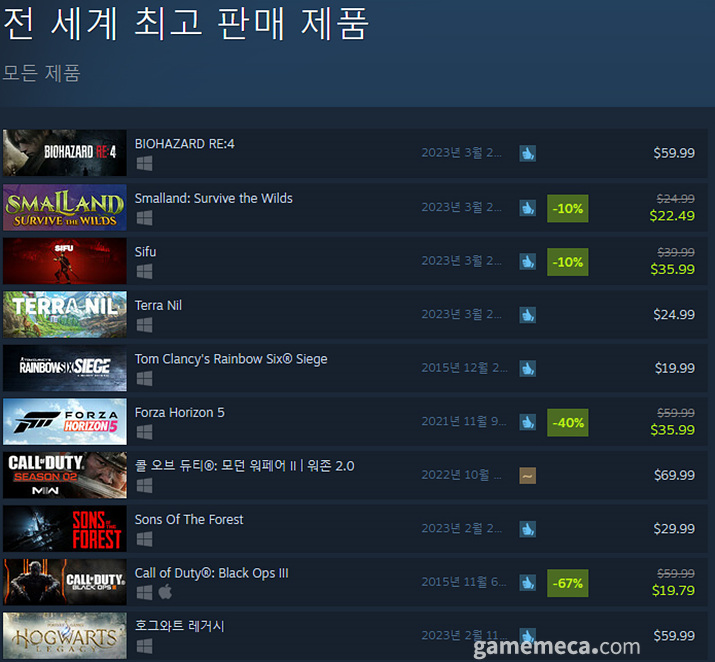 ▲ 3월 30일 오후 12시 기준 스팀 전세계 최고 판매 제품 TOP10 (자료출처: 스팀) |