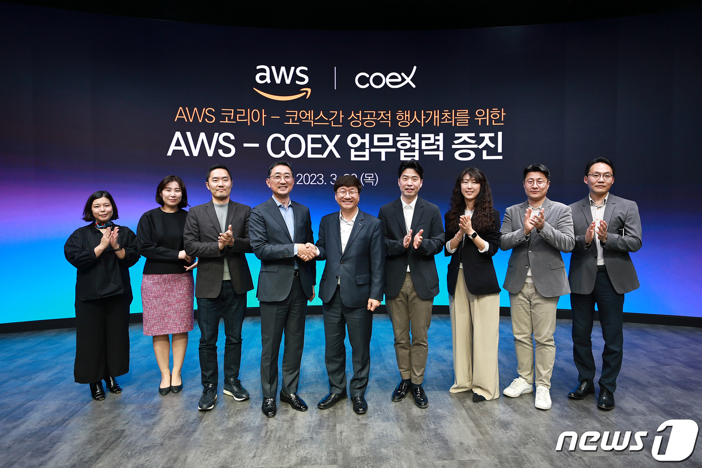 (서울=뉴스1) = 이동기 코엑스 사장(왼쪽 다섯 번째)과 함기호 아마존웹서비스코리아 대표(왼쪽 네 번째)가 30일 오후 서울 강남구 삼성동 코엑스 스튜디오159에서 MICE 산업 활성화와 아마존웹서비스가 개최하는 행사의 성공적인 개최를 위한 업무협약을 체결한 후 관계자들과 기념촬영을 하고 있다. (코엑스 제공) 2023.3.30/뉴스1