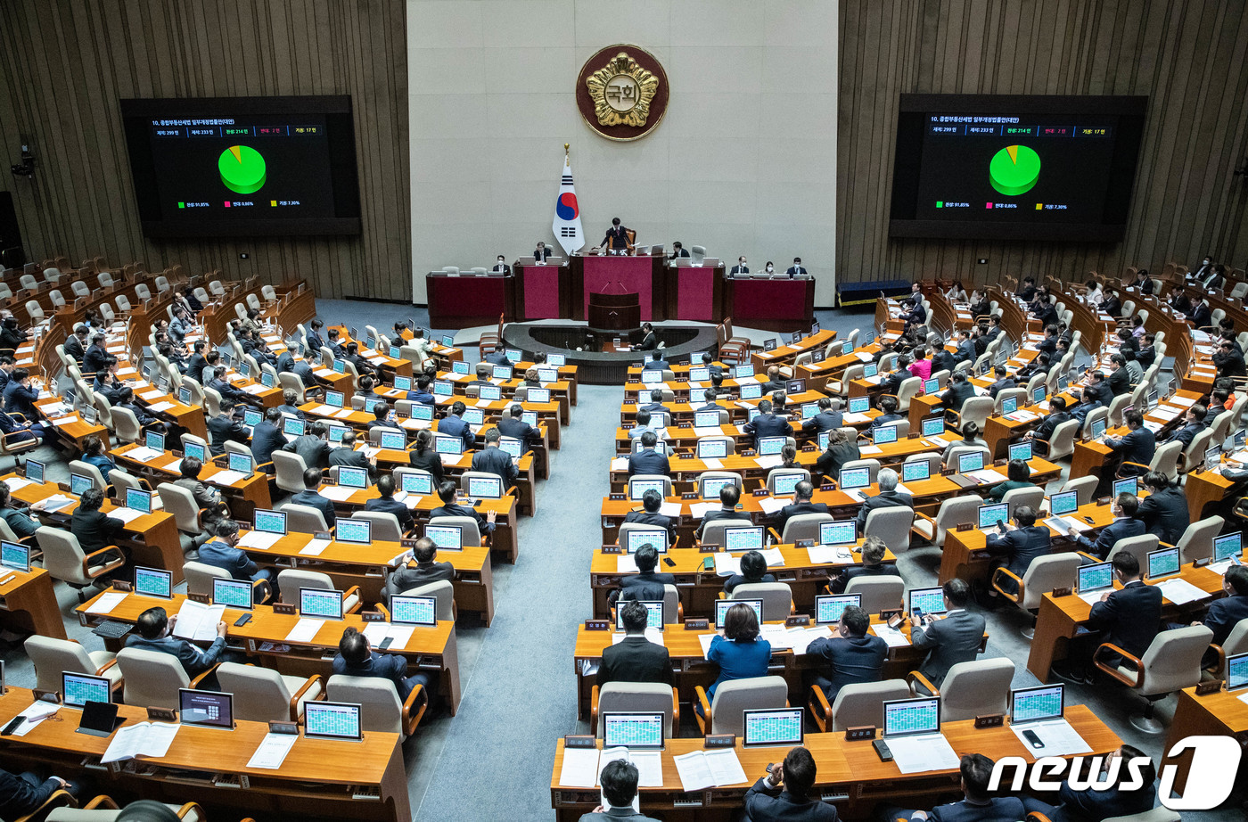 (서울=뉴스1) 이재명 기자 = 30일 오후 서울 여의도 국회에서 열린 제404회 국회(임시회) 제2차 본회의에서 종합부동산세법 일부개정법률안(대안)이 재석 233인, 찬성 214인, 반대 2인, 기권 17인으로 가결되고 있다. 2023.3.30/뉴스1
