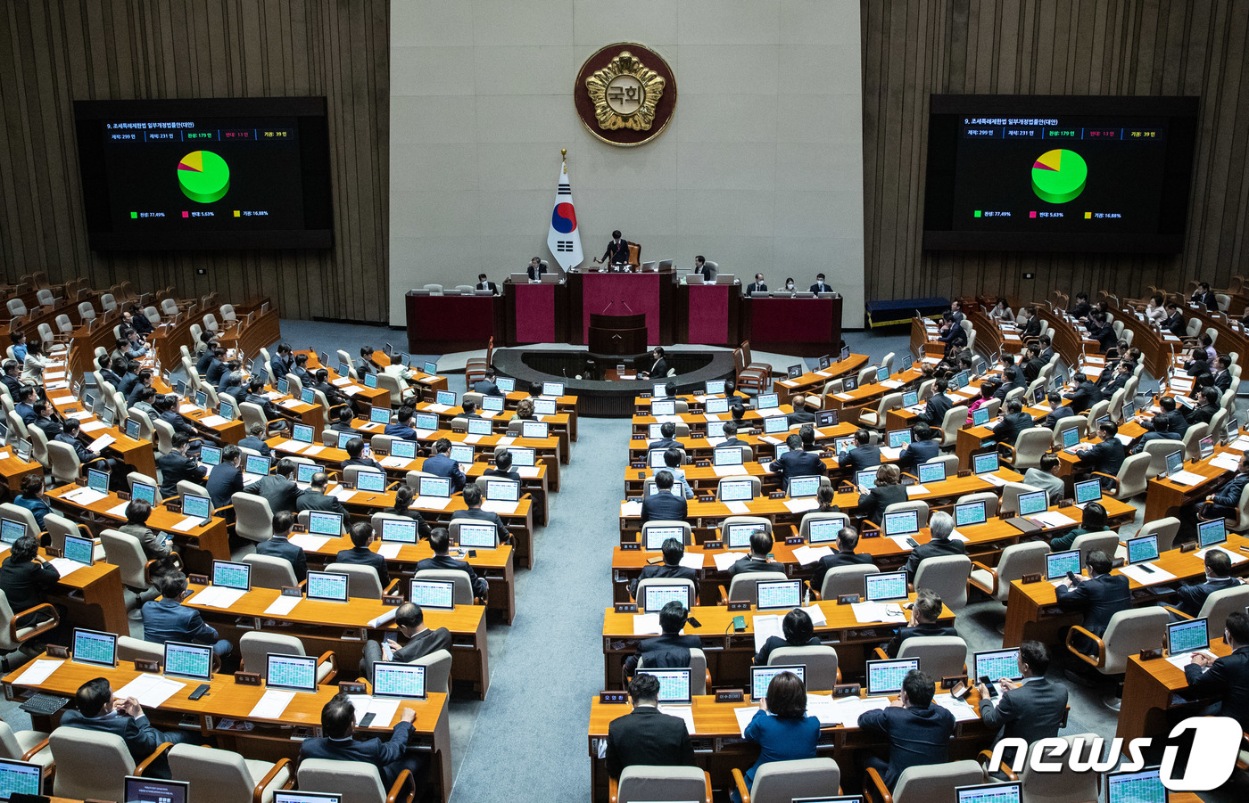(서울=뉴스1) 이재명 기자 = 30일 오후 서울 여의도 국회에서 열린 제404회 국회(임시회) 제2차 본회의에서 조세특례제한법 일부개정법률안(대안)이 재석 231인, 찬성 179인, 반대 13인, 기권 39인으로 가결되고 있다. 2023.3.30/뉴스1