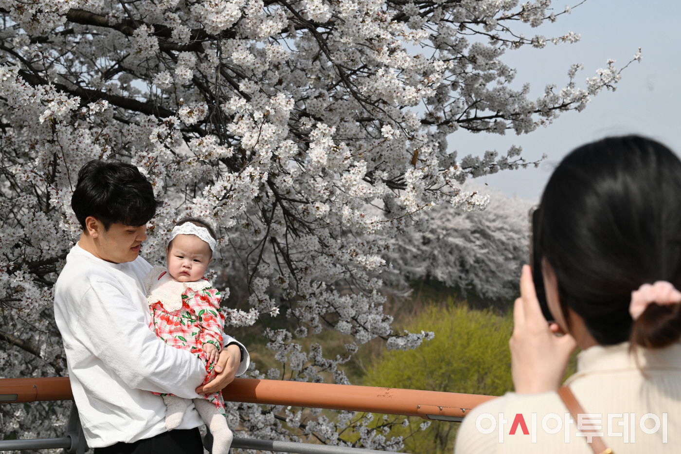 아시아투데이(조치원) 박성일 기자 = 30일 오후 세종시 조치원 조천 벚꽃길에서 아빠가 딸을 앉고 사진을 찍고 있다. |