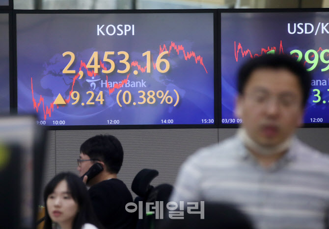 [이데일리 김태형 기자] 29일 오후 서울 중구 하나은행 딜링룸 전광판에 코스피가 전 거래일 대비 9.24포인트(0.38%) 오른 2,453.16을 나타내고 있다.
