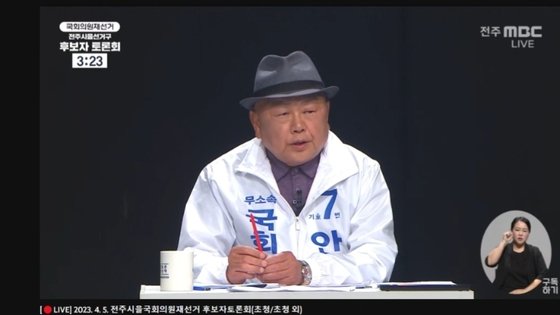 4·5 전주을 국회의원 재선거에 출마한 무소속 안해욱 후보가 지난 29일 전주MBC에서 방송된 후보자 토론회에서 "(자신은) 백은종 서울의소리 대표와 세례 요한 정대택과 함께하는 3대 독수리 중 한 명"이라며 "그 두 분도 그런 소리는 안 하지만 나는 용산대 앞에서, 관저 앞에 가서도 꼭 이렇게 먼저 외칩니다. 윤석열 이 XXX야"라고 말하고 있다. [사진 전주MBC 유튜브 캡처] |