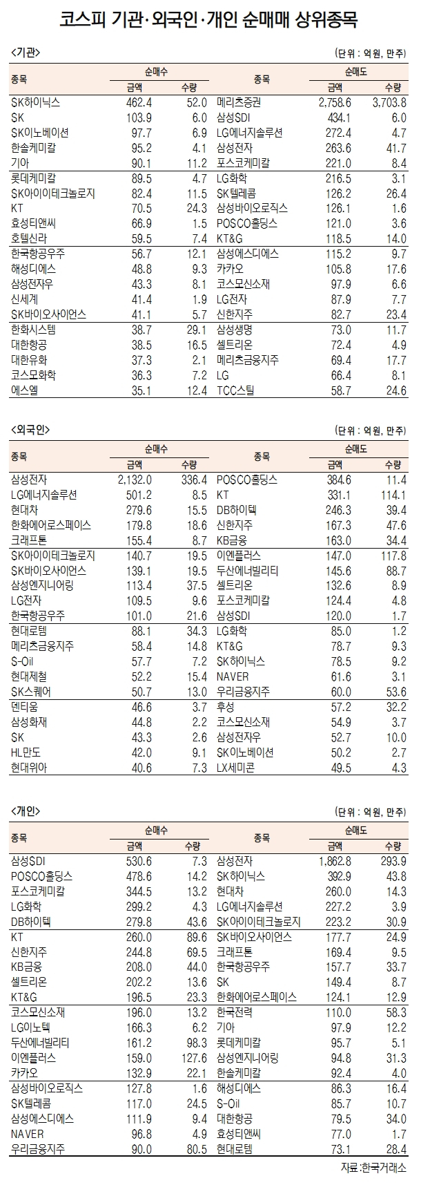 기관 순매수 상위종목으로는 SK하이닉스(000660)(462.4억 원)를 비롯해 SK(034730)(103.9억 원), SK이노베이션(096770)(97.7억 원), 한솔케미칼(014680)(95.2억 원), 기아(000270)(90.1억 원), 롯데케미칼(011170) (89.5억 원), SK아이이테크놀로지(361610)(82.4억 원), KT(030200)(70.5억 원), 효성티앤씨(298020)(66.9억 원), 호텔신라(008770)(59.5억 원), 한국항공우주(047810)(56.7억 원), 해성디에스(195870)(48.8억 원)등이고, 메리츠증권(2758.6억 원)과 삼성SDI(434.1억 원) LG에너지솔루션(373220)(272.4억 원), 삼성전자(005930)(263.4억 원), 포스코케미칼(221.0억 원), LG화학(216.5억 원), SK텔레콤(126.2억원), 삼성바이오로직스(126.1억 원), POSCO홀딩스(121.0억 원), KT&G(118.5억 원), 삼성에스디에스(115.2억 원)를 순매도 했다.
