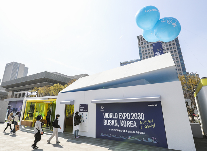 [서울=뉴시스] 동효정 기자 = 삼성전자가 다음달 3일까지 광화문광장에서 열리는 2030 부산세계박람회(엑스포) 유치 기원 행사 '광화에서 빛;나이다'에서 갤럭시 스튜디오를 운영한다.