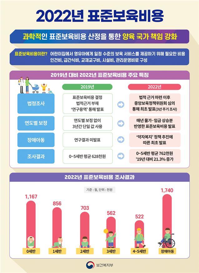 [서울=뉴시스] 30일 보건복지부에 따르면 2022년 표준보육비용'으로 0세반은 116만7000원, 1세반은 85만6000원, 2세반은 70만3000원, 3세반은 56만2000원, 4~5세반은 52만20000원이다. (사진제공=보건복지부) 2023.03.30. photo@newsis.com *재판매 및 DB 금지 |