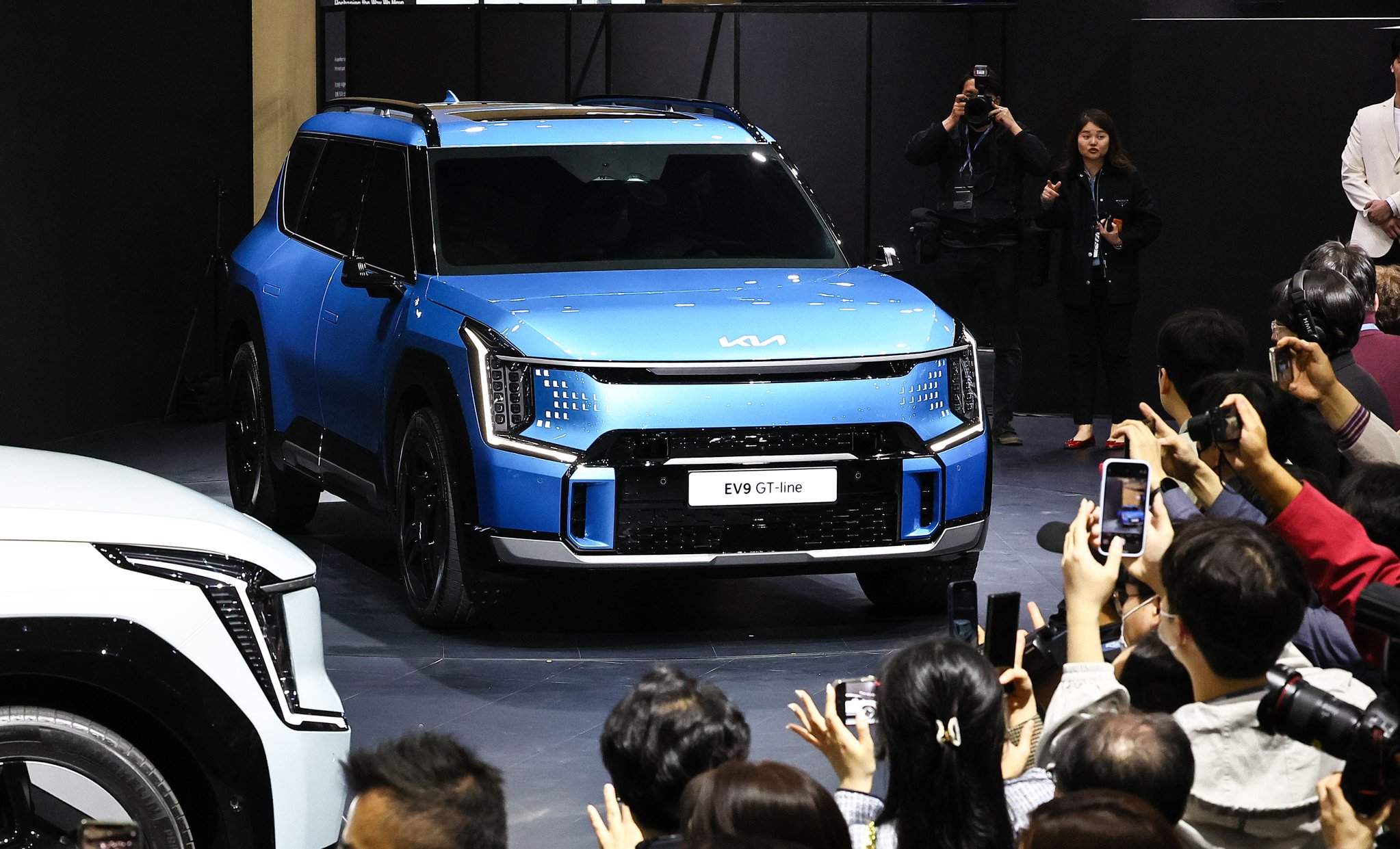 미디어데이 행사에 참석한 언론인들이 기아차의 첫 대형 전기차 SUV EV9을 살펴보고 있다. |
