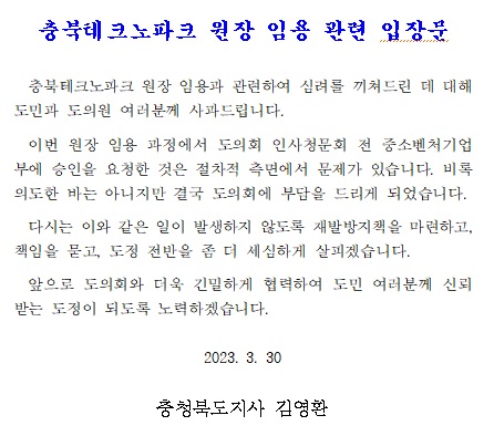 앞서 도의회 산업경제위원회는 지난 20일 충북테크노파크 원장 임용후보자 인사청문회를 할 계획이었으나 닷새 전 중소벤처기업부 장관이 임용을 승인 결정한 것으로 확인되면서 청문회를 취소했다.