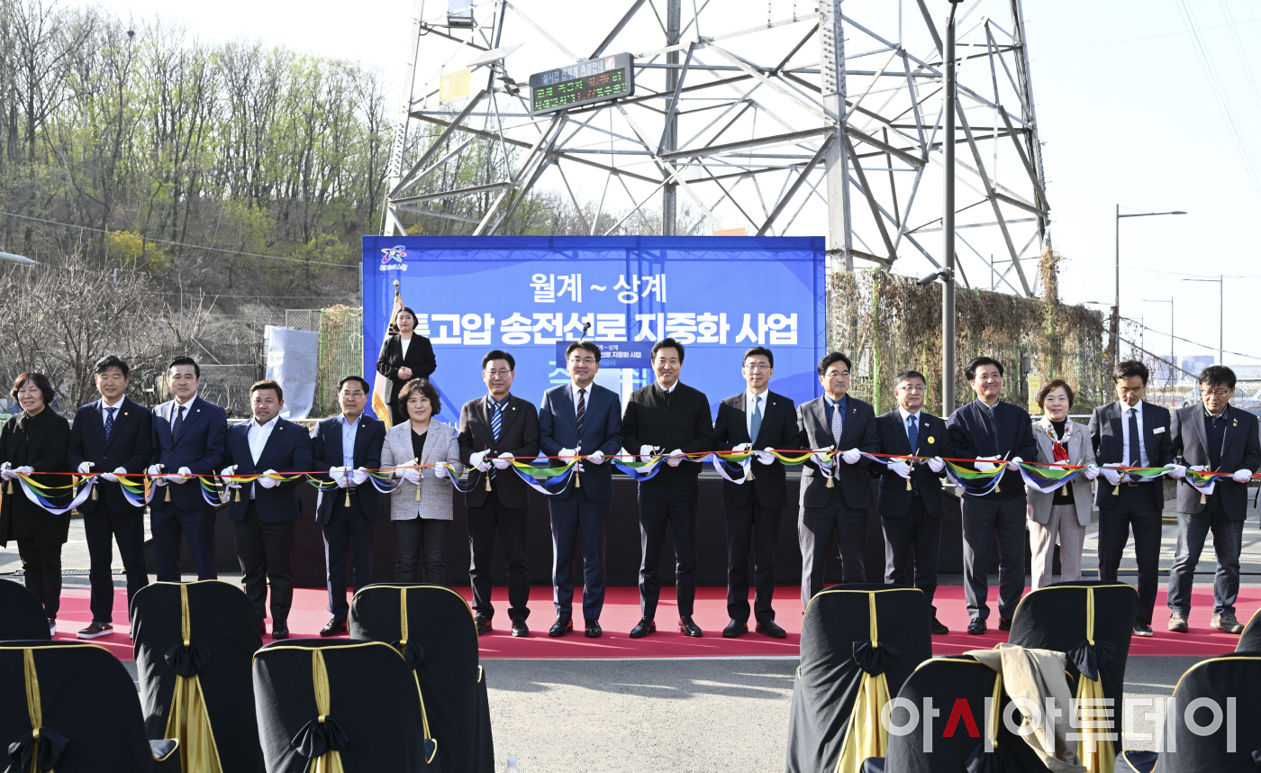 아시아투데이 정재훈 기자 = 30일 오후 서울 노원구 월계동 송전철탑 앞에서 열린 '월계~상계 특공압 송전선로 지중화 사업 착공식'에서 오세훈 서울시장과 오승록 노원구청장, 고용진 의원, 우원식 의원, 김성환 의원 등 참석자들이 테이프 커팅을 하고 있다.