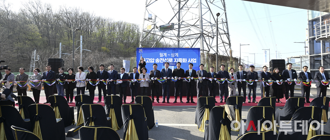 아시아투데이 정재훈 기자 = 30일 오후 서울 노원구 월계동 송전철탑 앞에서 열린 '월계~상계 특공압 송전선로 지중화 사업 착공식'에서 오세훈 서울시장과 오승록 노원구청장, 고용진 의원, 우원식 의원, 김성환 의원 등 참석자들이 테이프 커팅을 하고 있다.