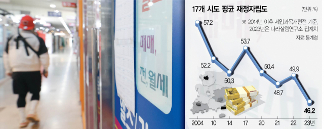 30일 서울경제신문이 통계청과 나라살림연구소 데이터를 종합한 결과 부동산 호황에 따른 반짝 세입 증가로 49.9%까지 올랐던 17개 광역시도의 재정자립도는 올해 다시 46.2%로 하락 반전할 것으로 전망된다. 2004년 57.2%에서 2021년 48.7%로 50%대가 처음 붕괴된 후 계속 40%대를 기록했다. 근 20년간 재정자립도가 11%포인트 빠진 셈이다. 재정자립도 50%미만은 지자체가 중앙정부로부터 세입의 절반 이상을 지원받는 구조라는 얘기다.