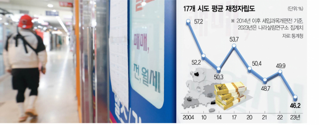 30일 서울경제신문이 통계청과 나라살림연구소 데이터를 종합한 결과는 이를 여실히 보여준다. 올해 17개 광역시도의 재정자립도는 46.2%로 지난해의 49.9%(세입 과목 개편 전 기준)보다 3.7%포인트 하락할 것으로 전망된다. 재정자립도 악화가 하루 이틀 된 문제는 아니지만 지방의 자체 세입이 갈수록 축소되면서 내년에는 세입 과목 개편 후 기준으로도 최저점을 기록할 가능성마저 제기된다. 세입 과목 개편으로 이월금·잉여금 등을 세외수입에서 제외해 하락 추세가 더욱 가팔라져 2021년 43.6% 저점을 기록한 바 있다.