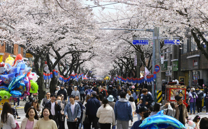 26일 낮 제주시 전농로 일대에서 열린 제16회 전농로 왕벚꽃 축제장을 찾은 제주도민과 관광객들이 활짝 핀 벚꽃을 감상하며 즐거운 주말을 보내고 있다. (사진=연합뉴스) |