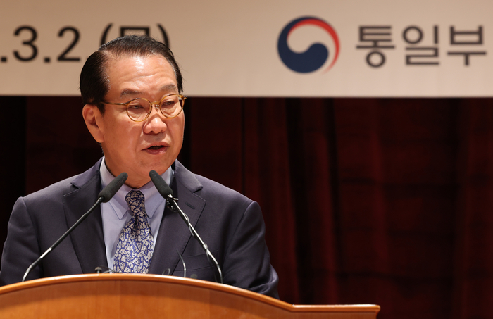 권영세 통일부 장관이 지난 2일 정부서울청사 별관에서 열린 통일부 창설 54주년 기념식에서 기념사를 하고 있다. 연합뉴스 |