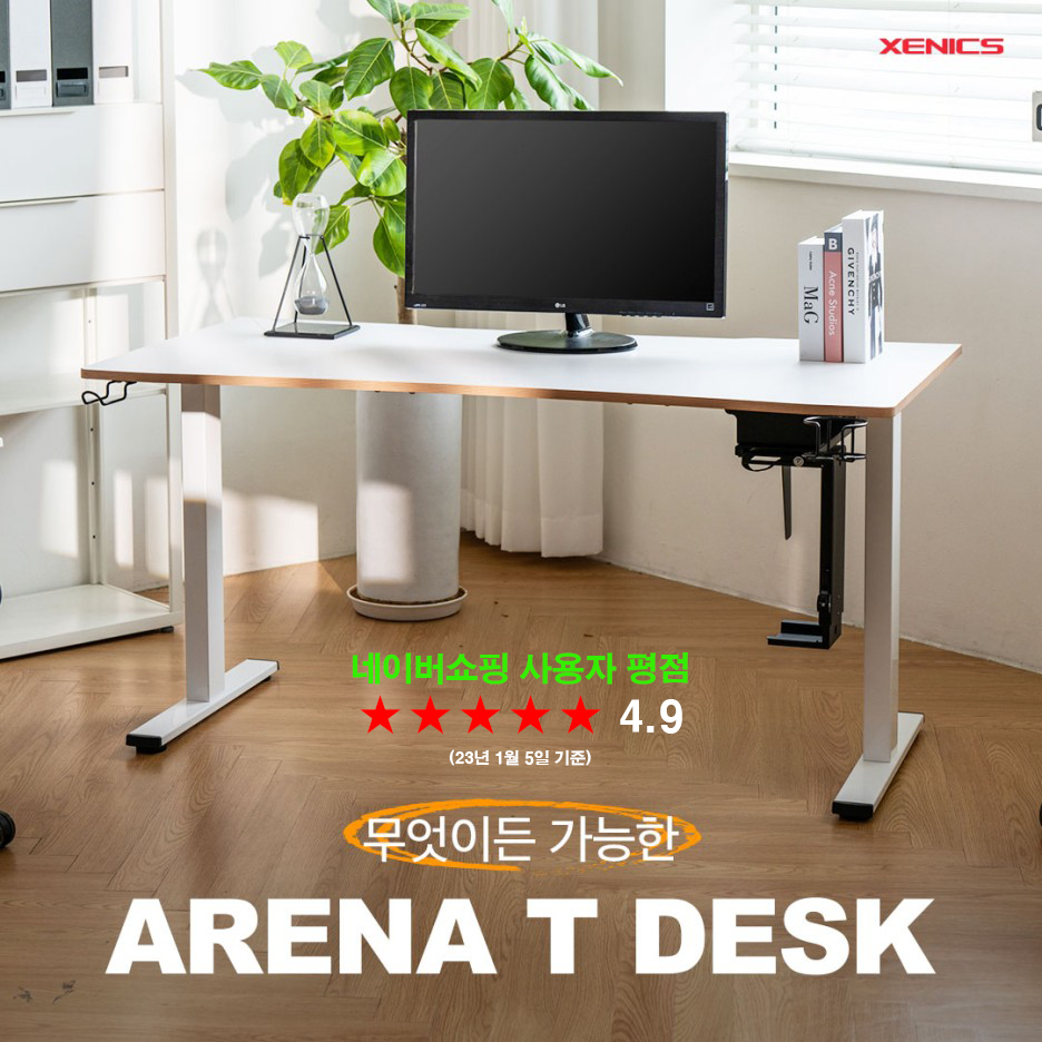 아레나 T 데스크는 전면 얼고 커브가 들어간 인체공학적 디자인과 함께 별도로 구매할 수 있는 컵홀더, 헤드셋 거치대, 멀티탭 트레이 등 다양한 액세서리를 활용하여 공간 활용도를 높인 제품이다.