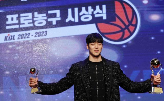 올 시즌 한국프로농구 최우수선수에 등극한 서울 SK의 김선형이 30일 서울 강남구 그랜드 인터컨티넨탈 서울 파르나스호텔에서 열린 2022~23시즌 SKT 에이닷 프로농구 시상식에서 트로피를 들고 포즈를 취하고 있다. 김선형은 올 시즌 베스트 5에도 올라 2관왕을 차지했다. 뉴스1 |