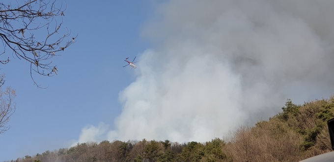 산불이 거세지자 오후 2시30분 헬기 출동을 요청했으며 오후 4시18분에는 대응1단계를 발령해 진화 중이다.