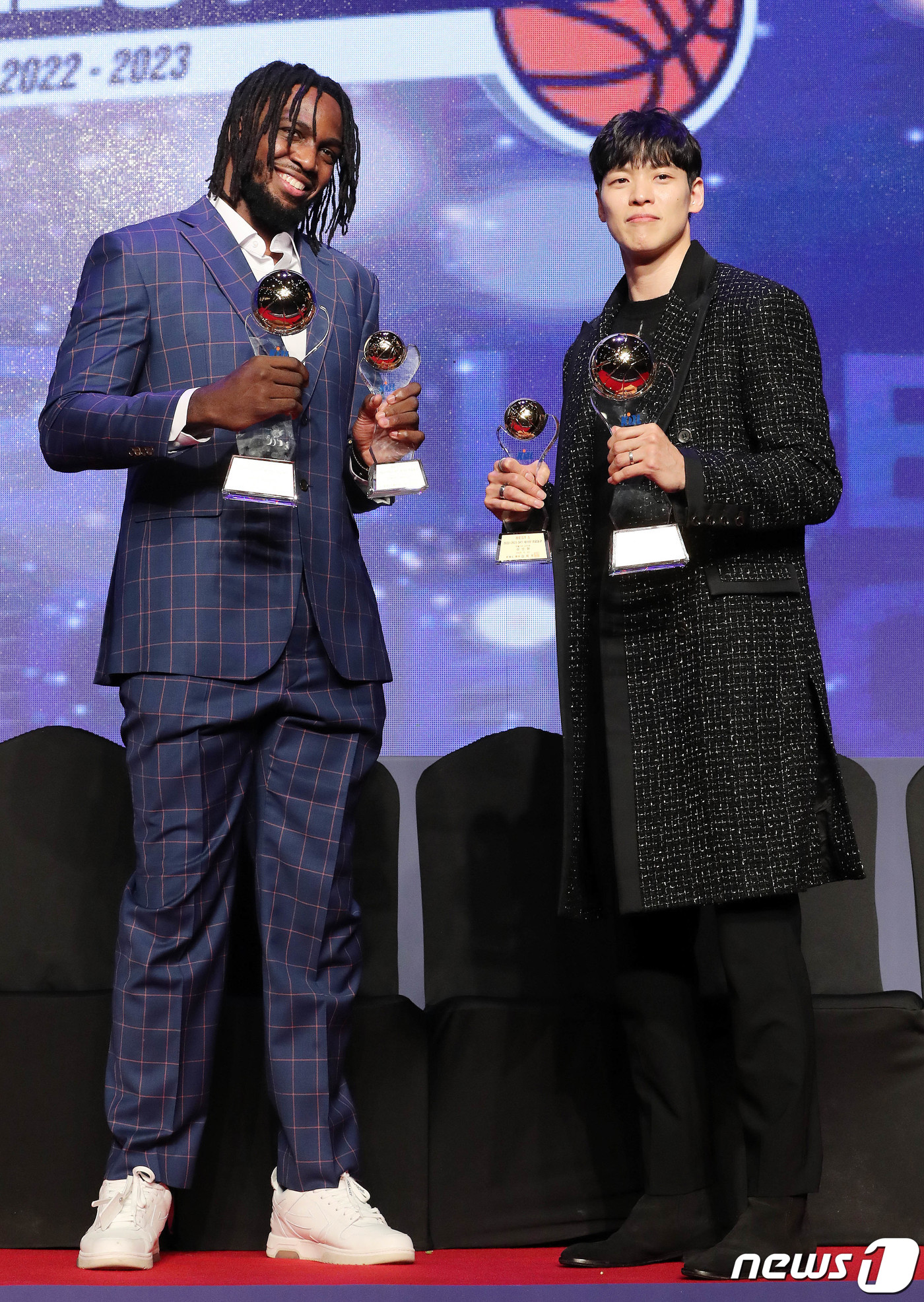 (서울=뉴스1) 박세연 기자 = 30일 서울 강남구 그랜드인터컨티넨탈 서울파르나스호텔에서 열린 2022-2023 SKT 에이닷 프로농구 시상식에서 국내선수 MVP SK 김선형과 외국인선수 MVP SK 자밀 워니가 기념촬영을 하고 있다. 2023.3.30/뉴스1