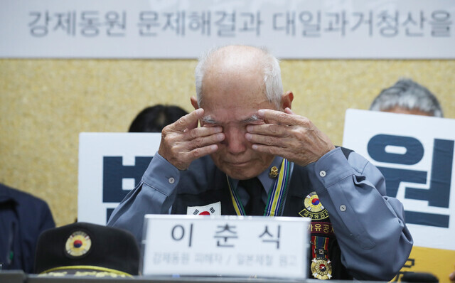 일제 강제동원 피해자 이춘식 할아버지가 대법원 판결이 나온 지 1년 뒤인 2019년 10월 강제동원 문제 해결을 위한 기자회견에서 한 초등학생이 쓴 편지를 들으며 눈물을 닦고 있다. 백소아 기자 thanks@hani.co.kr |