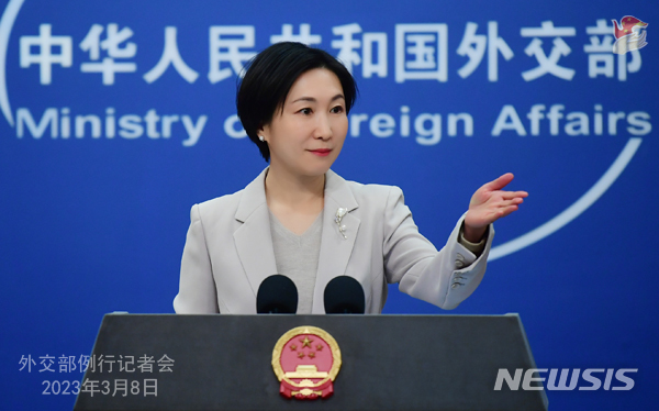 [서울=뉴시스] 중국 외교부 마오닝 대변인은 30일정례브리핑에서 "미국 측이 중국의 엄정한 교섭 제기와 반복된 경고에도 불구하고 차이잉원의 경유 형식의 미국 방문을 허용한 데 대해 강력한 항의와 규탄을 표한다"고 밝혔다. 사진은 정례 기자회견 중인 마오 대변인의 모습. <사진출처: 중 외교부 사이트> 2023.03.08 |