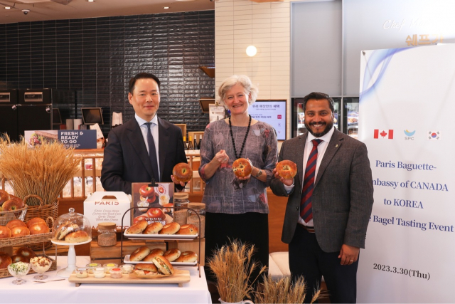타마라 모휘니(가운데) 주한캐나다대사관 대사대리와 딘 디아스(오른쪽) 캐나다 곡물협회장이 30일 서울 파리바게뜨 강남서초점을 방문해 캐나다 밀로 만든 '두번쫄깃 베이글'을 시식하는 등 체험방문 행사를 마치고 허진수 SPC 사장과 기념촬영을 하고 있다. 모휘니 대사대리는 “베이글은 캐나다인이 즐겨 먹는 빵”이라며 "쫄깃한 식감과 풍미를 잘 살린 파리바게뜨의 기술력에 놀랐다"고 평가했다. 한편 SPC는 이달 초 토론토에 파리바게뜨 캐나다 1호점을 열었다. /사진제공=SPC