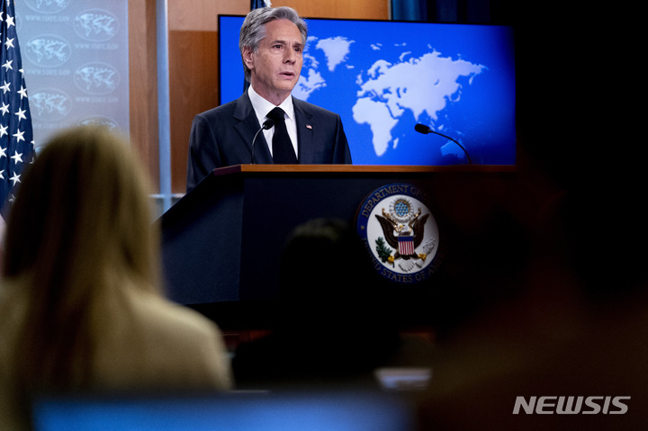 [워싱턴=AP/뉴시스]토니 블링컨 미국 국무장관이 20일(현지시간) 국무부 청사에서 2022년 국가별 인권보고서와 관련해 기자회견을 하고 있다. 2023.03.21. |