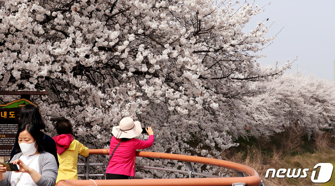 30일 세종시 조치원읍 번암리 조천주변에 벚꽃이 만개한 가운데 봄을 즐기는 시민들이 사진을 찍으며 산책하고 있다. 2023.3.30/뉴스1 ⓒ News1 김기남 기자 |