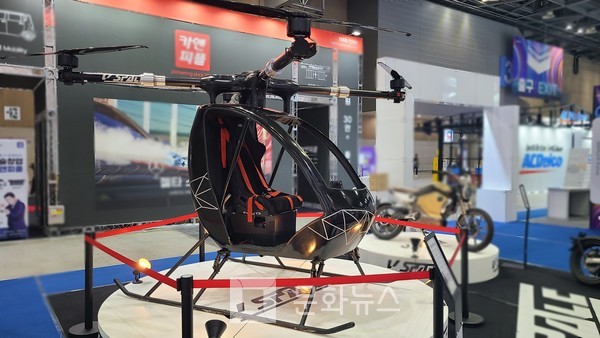 30일 일산 킨텍스 제1전시장에서 펼쳐진 '2023서울모빌리티쇼(Seoul Mobility Show2023)' 프레스 브리핑에서 1인승 전동 헬기 V스피드가 위용을 자랑하고 있다.