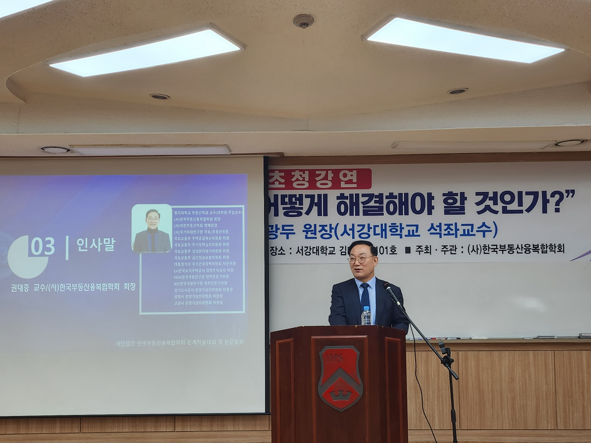 권대중 한국부동산융복합학회장이 30일 서강대 김대건관에서 열린 '2023년 춘계학술세미나'에서 인사말을 하고 있다. |