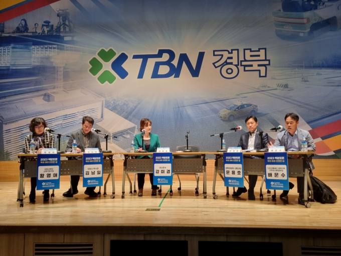경북TBN국민안전프로젝트 '백분토론(우리 아이 안전한 길)'에 참여한 황영애 포항교육청 국장, 김남일 포항시 부시장, 강미경 아나운서, 문용호 경북경찰청 교통과장, 배문수 도로교통공단 경북지부 부장(사진 왼쪽부터). (TBN경북교통방송 제공) 2023.03.30 |