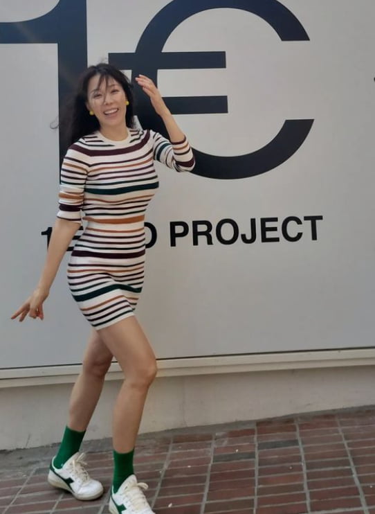 공개된 사진 속 김정임은 벚꽃 구경에 나선 모습. 그는 몸에 핏되는 원피스를 입고 탄탄한 바디라인을 뽐냈다.