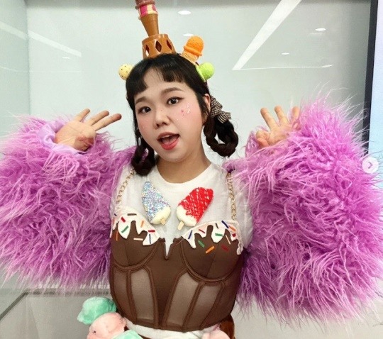 사진 속 홍현희의 아이스크림 모양 의상을 입고 화려한 비주얼을 자랑한다. 홍현희는 귀여운 매력을 보여준다.
