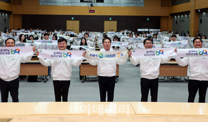 [이데일리 김태형 기자] 조소행(가운데) 상호금융대표이사와 임직원들이 30일 대학생봉사단 'NH콕서포터즈 2기 발대식'에서 학생들과 서포터즈 응원 퍼포먼스를 하고 있다.
