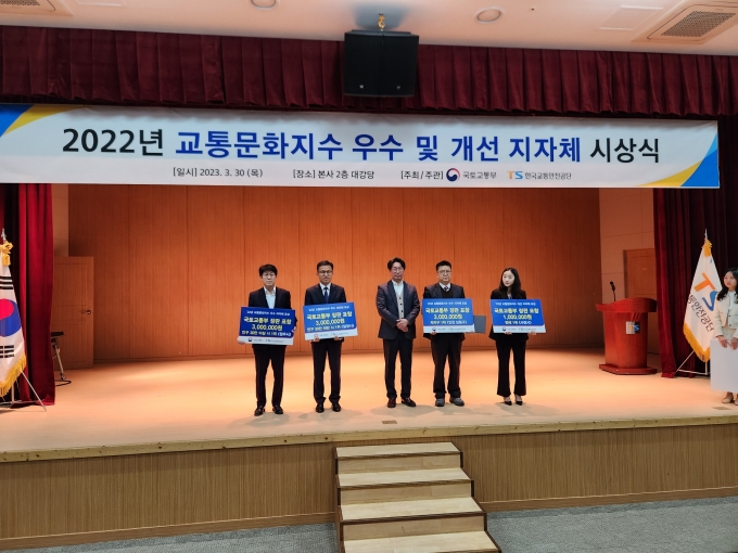 박정태 밀양시 교통행정과장(왼쪽 두 번째)이 30일 한국안전교통공단 2층 대강당에서 열린 2022년 교통문화지수 우수 및 개선 지자체 시상식에서 장관상을 받고 기념사진을 찍고 있다.[사진=밀양시] 2023.03.30 |
