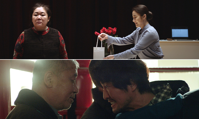 연극 무대를 그대로 스크린으로 옮겼다고 하면, 연극의 중요한 특성인 현장감을 놓치고 재미도 없는 이도 저도 아닌 영화가 아닐까 하는 선입견을 가질 수 있다. 노란 백라이트의 후광을 받으며 무릎 꿇고 앉아있는 주인공 희경(이솜)과 다른 등장 인물의 상반신 사진이 줄줄이 박혀 있는, 극장에서 담배 피우던 시절에 만든 것 같은 포스터를 보면 이런 심증은 확신으로 굳어질지도 모른다.