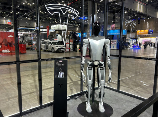 테슬라는 30일 경기 고양 킨텍스에서 열린 ‘2023 서울모빌리티쇼’ 언론 공개행사에서 지난해 공개됐던 인간형 로봇 ‘테슬라봇’의 모형을 전시했다.