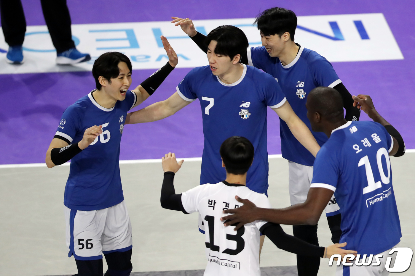 (인천=뉴스1) 황기선 기자 = 30일 오후 인천 계양체육관에서 열린 프로배구 도드람 2022-2023 V리그 챔피언결정전 1차전 남자부 대한항공과 현대캐피탈의 경기에서 득점에 성공한 현대캐피탈 선수들이 기뻐하고 있다. 2023.3.30/뉴스1