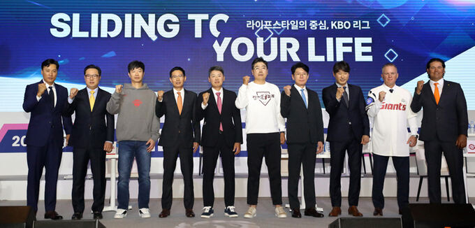 “파이팅” 프로야구 10개 구단 감독들이 30일 서울 용산구 하얏트호텔에서 열린 미디어데이에서 화이팅을 외치며 기념촬영을 하고 있다. 왼쪽부터 이승엽(두산), 박진만(삼성), 김종국(KIA), 염경엽(LG), 김원형(SSG), 홍원기(키움), 이강철(KT), 강인권(NC), 서튼(롯데), 수베로(한화) 감독. 뉴스1 |