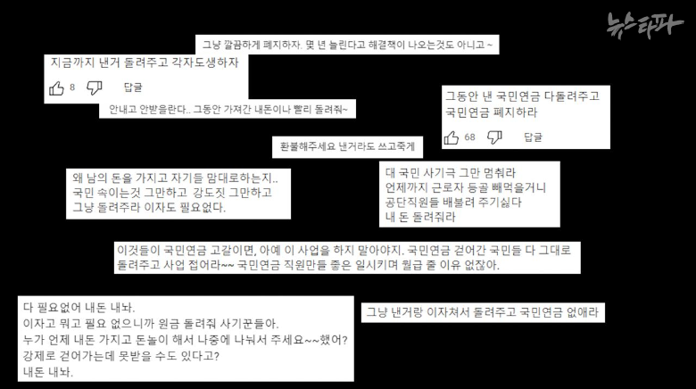 수용자들의 반응은 공포에 가깝다. ‘이자는 바라지도 않으니 그동안 냈던 원금이라도 돌려달라’, ‘노후준비는 내가 알아서 할 테니 국민연금 폐지하라’는 식의 인터넷 댓글이 연금개혁 기사마다 수십, 수백 개씩 달린다. 주로 청년세대들의 의견이다. 미래에 국민연금의 유지 부담은 늘지만 정작 본인은 혜택을 받을 수 없다는 불안이 팽배하다.